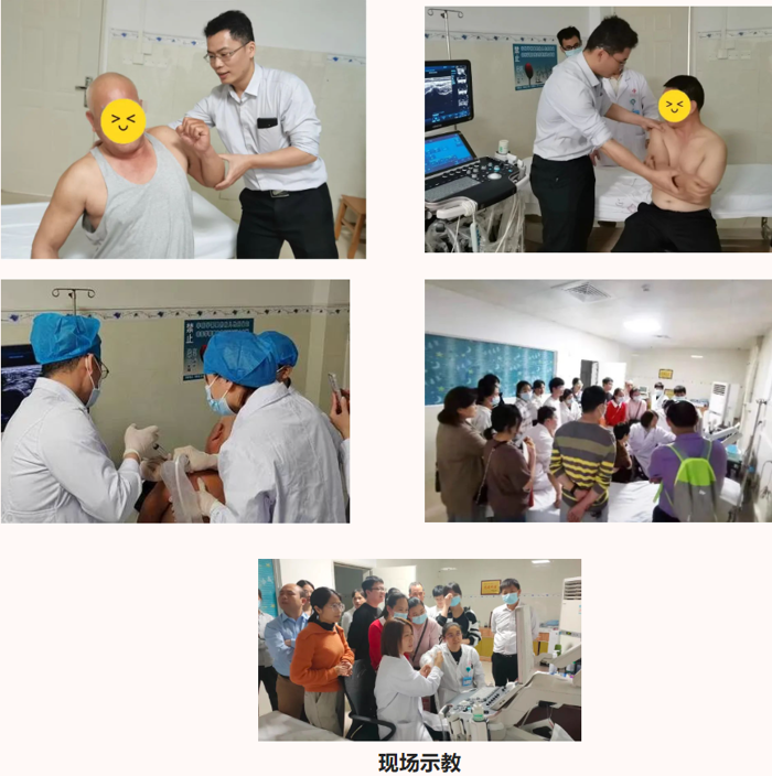 会后,我院肌骨团队深入贵港市第二人民医院超声科进行现场病例演示,受肌骨疾病困扰的10名患者涌跃报名检查。学员们对肌骨超声及肌骨介入治疗有着浓厚的兴趣,纷纷到现场观摩,并亲自体验操作。我院肌骨团队专家耐心指导,详细解答了学员们的疑问。骨伤科黄江华通过现场询问患者的病史、体格检查及肌骨超声,给予了针对性的治疗意见,并对典型的冻结肩患者进行肌骨超声引导下液压扩张松解术,疗效显著,得到了患者及学员们的一致好评。