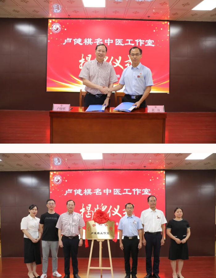 双方共同签署协议,并为“广西名中医卢健棋工作室”揭牌。
